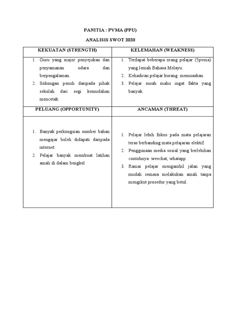 Analisis swot panitia bahasa melayu sekolah rendah. Kelemahan w1 penguasaan mata pelajaran bahasa melayu dan. Contoh analisis swot visi misi seo rajawali cute766.