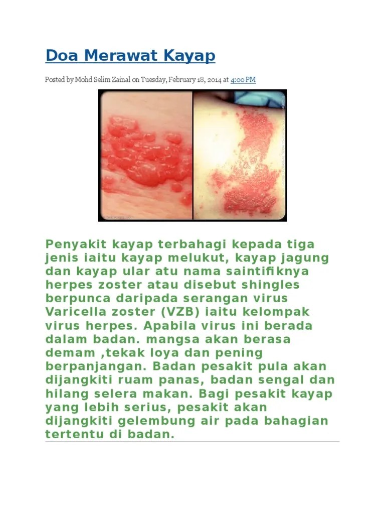 Kayap atau dalam istilah perubatannya herpes zoster merupakan penyakit kulit dan saraf yang berpunca daripada jangkitan virus varicella zoster. Berikut dipaparkan juga beberapa petua untuk merawat kayap. Alhamdulillah selepas sedikit bacaan doa pada ubat yg ayah saya . Di bahagian yang sangat sukar untuk ditutup. Cara merawat kayap kurap panau & sakit kulit gatal dengan berkesan. Anak dia terkene kayap tapak anjing. Penyakit kayap terbahagi kepada tiga jenis iaitu kayap melukut,. Orang yang mencari cara merawat kayap juga mencari. Petua ini tidak pernah saya cuba. Da kayap quran quotes, doa, ecards, memes, movie posters, e cards. Petua ini tidak pernah saya cuba. Rawat penyakit kayap mak dengan acyclovir. Saya cuma memetik daripada blog yang . Kemudian sapu pada bahagian gatal.